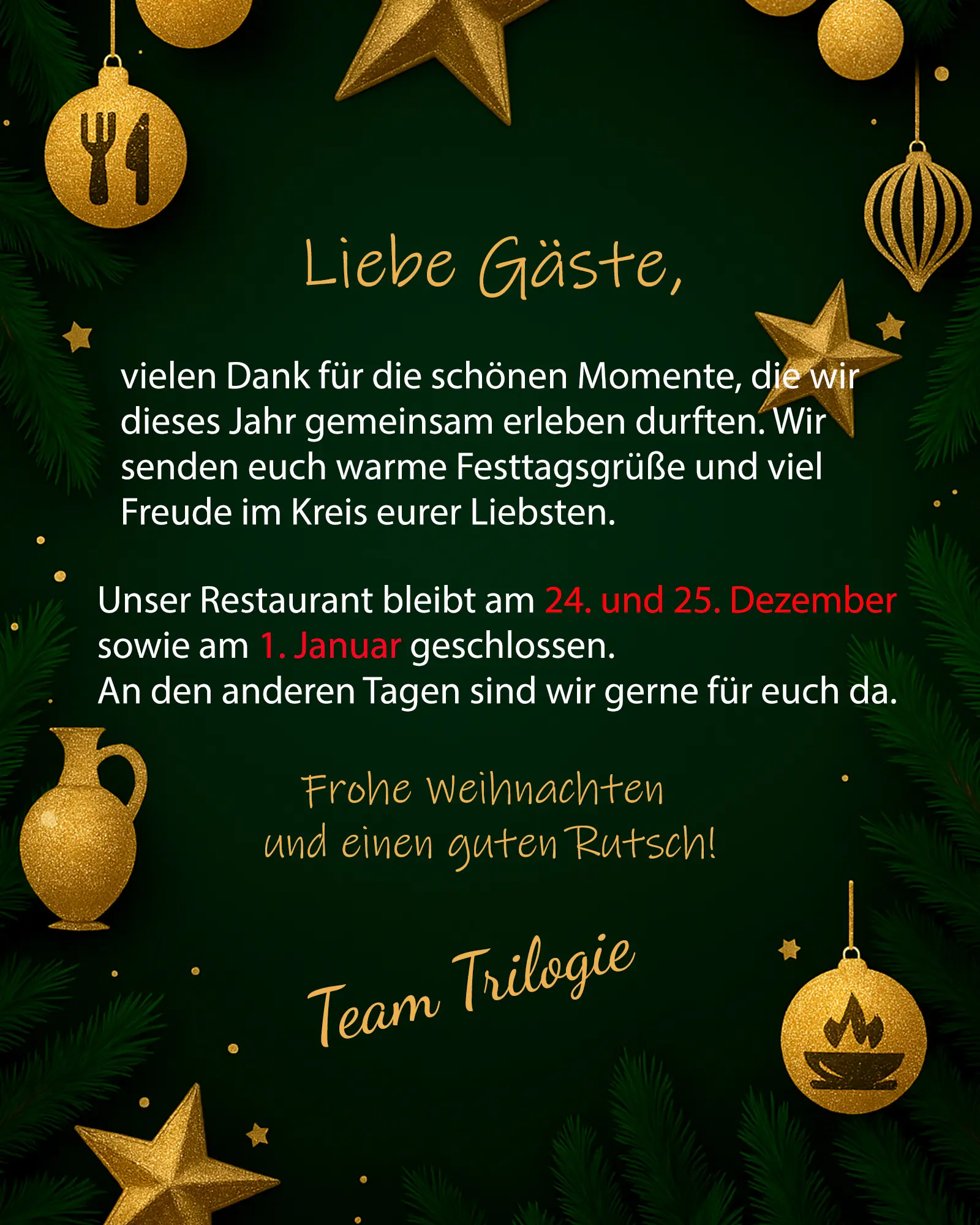 Trilogie unites three friends – Niko, Nelo, and Dimi – who share a love for Greece’s rich culinary tradition. Since 2014, we have been serving the finest Greek specialties, bringing a taste of home to the heart of Vienna. Our motto, ‘Eating is a necessity, enjoying is an art,’ encapsulates the essence of our mission: to make every meal an unforgettable moment of joy.